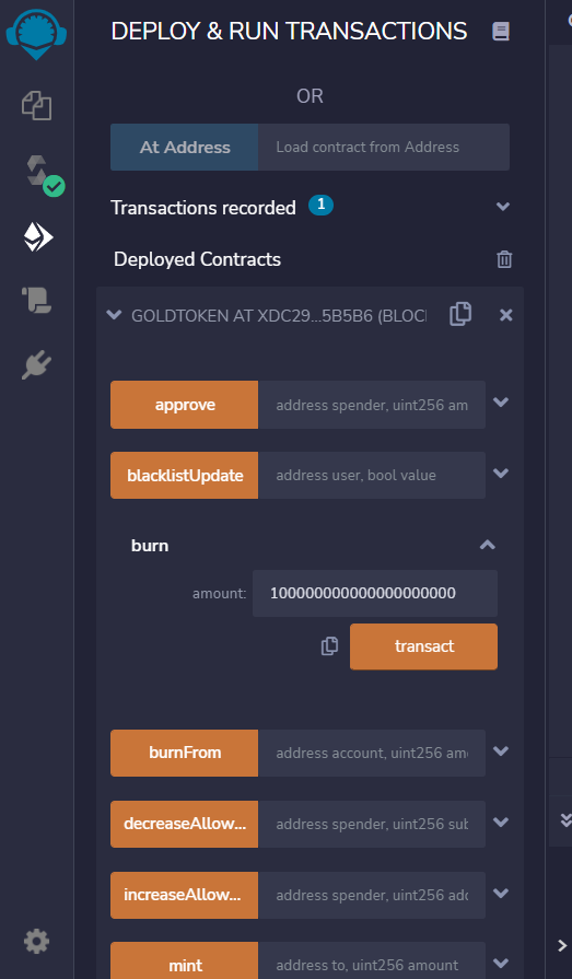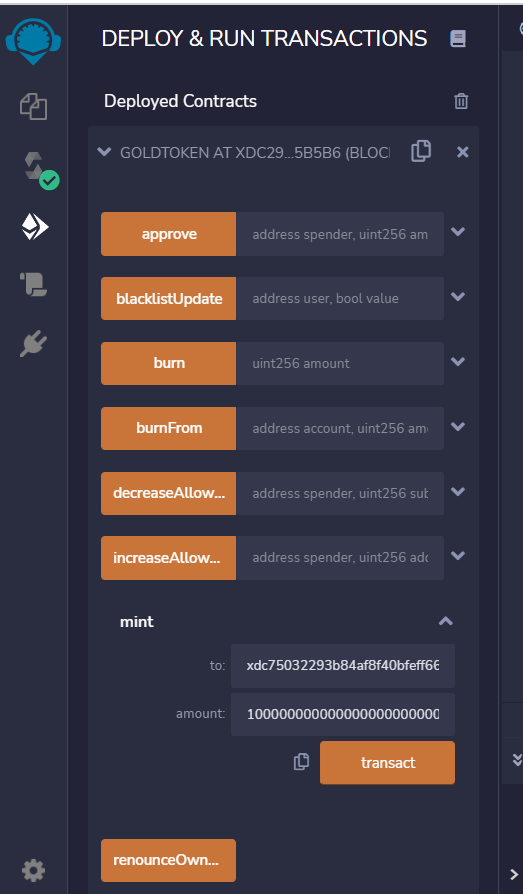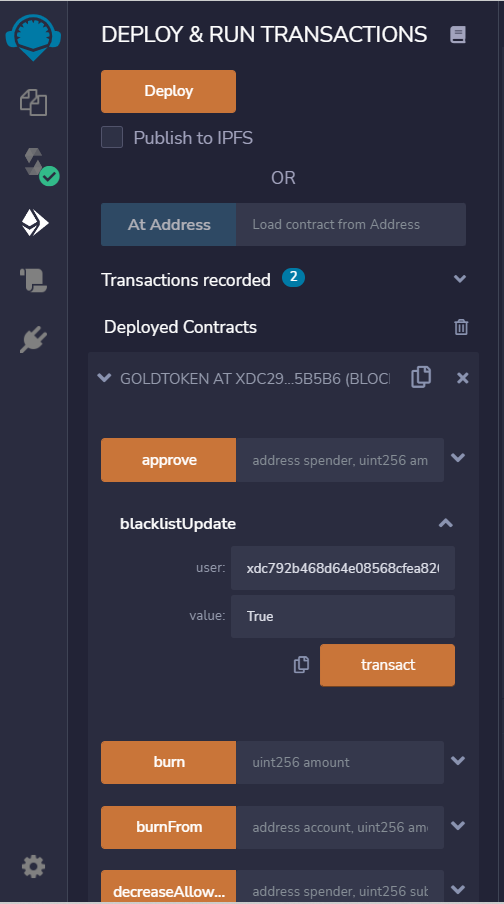 Blacklistupdate — Allows to block the users by entering the user address and entering the boot value as True and false. Once the address is blacklisted the blacklisted address will not be able to receive or send the funds