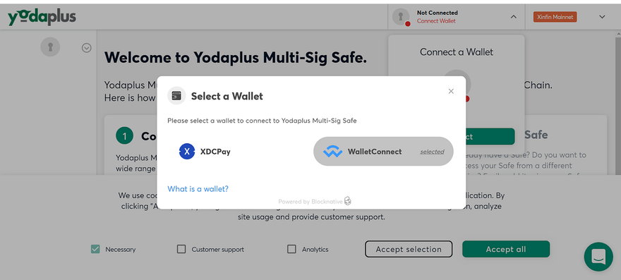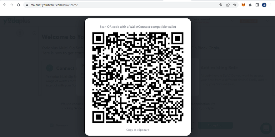 Step 1) Go to the Yodaplus multi-signature wallet website from your browser, click on connect wallet, and select wallet connect.