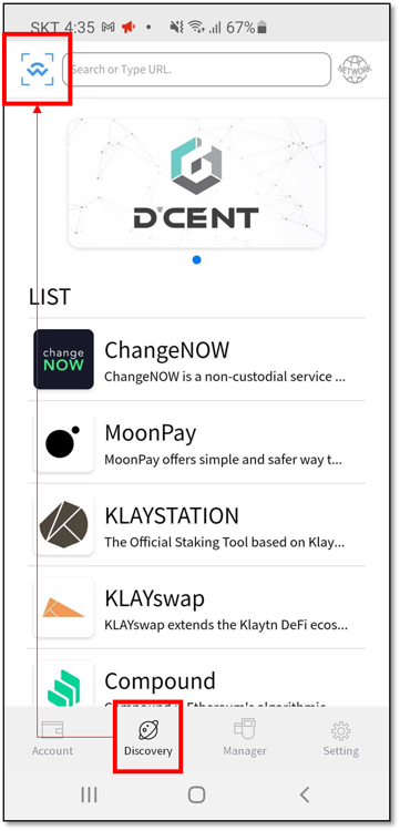 Step 3 Launch your D’CENT Mobile App, and go to the ‘Discovery’ tab. On the top of left corner is a WalletConnect Scan icon. Click and scan the QRCODE.