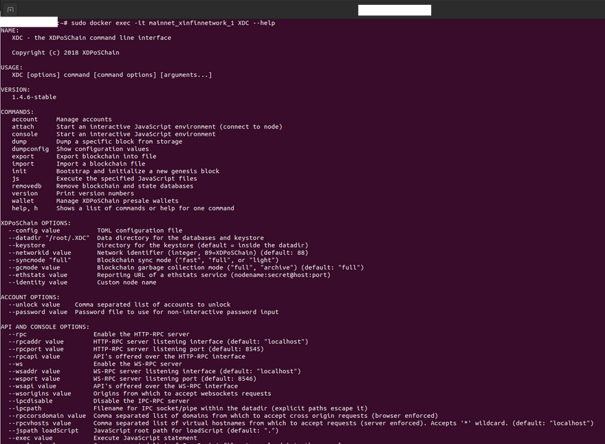 sudo docker exec -it mainnet_xinfinnetwork_1 XDC --help