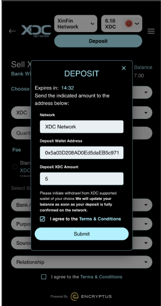 A new window will open with the XDC.Cash widget. Follow these steps: