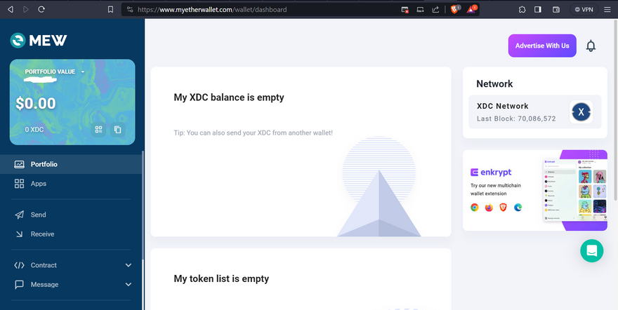 One thing to keep in mind is that MEW doesn't support XDC prefix. So the wallet address in here would start with 0x prefix and in order to move funds from here to some exchange or wallet that supports XDC prefix, you'll have to replace the XDC prefix of the destination wallet address with 0x.