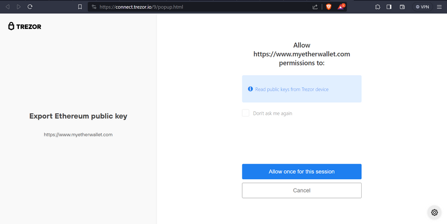 This window will ask you to grant permission to read public keys from your Trezor device. You can choose to allow once for this session or check the box to remember your choice.