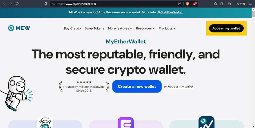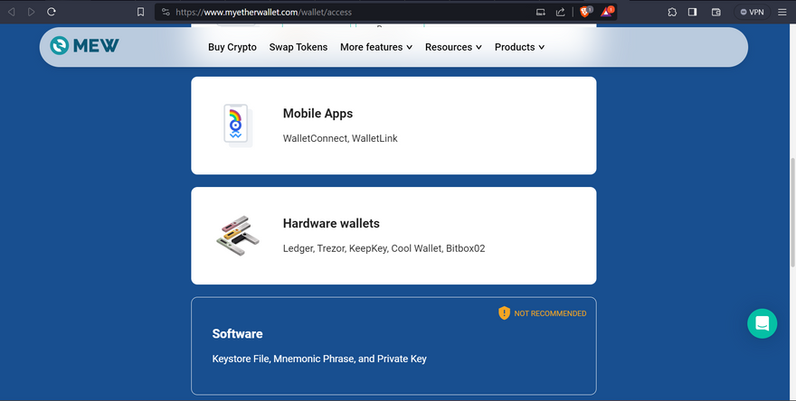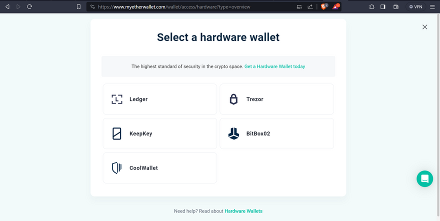 Once you click the my access wallet button, You will see a new tab with different options to access your wallet. Scroll down and look for the hardware wallets option.