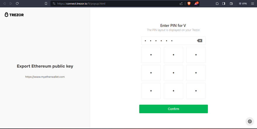 Use the dots on the screen to match the PIN on your Trezor device and click confirm. Now, Click on the standard wallet tab to access your wallet.