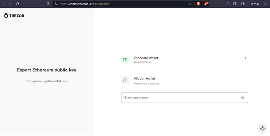 Select Trezor from the list and a new window will open: Trezor Connect (https://connect.trezor.io/9/popup.html).
