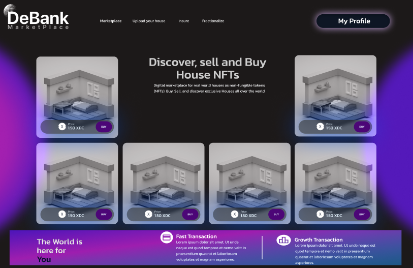 De-Bank De-Bank is very similar to a day-to-day bank in a real life but powered with blockchain technology and runs in the blockchain world. We are coming up with a new financial product called 'NFTHomes' where users can mint their home documents on our platform and make it into a NFT. The minted NFT's can be sold to a buyer by which the smart contract transfers the digital ownership to the respective person who bought it. DeBank is not just a regular bank. Where we stand out from a normal bank is by providing home loans which are paid in cryptocurrencies. Not everyone today can buy their dream homes, some might have less funds and some might be in a difficult situation to raise funds. So buyers Can approach our Home Loans which are processed 10x faster than a normal bank without any documents or their credit score. Home Loans, Insurances, Yield Farming(Lending and Borrowing) is few of our financial products.