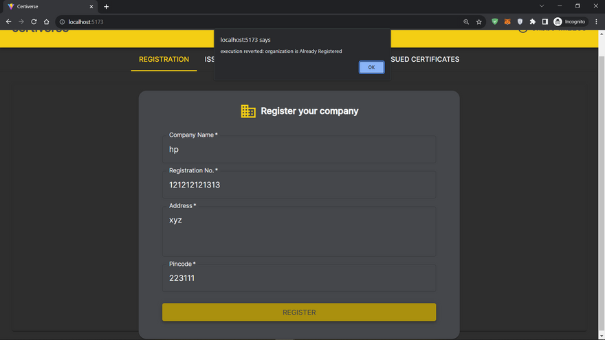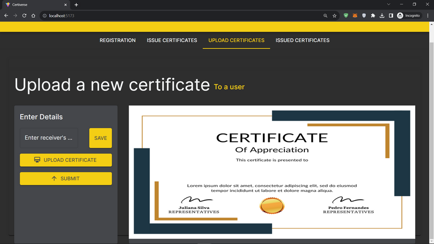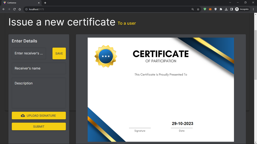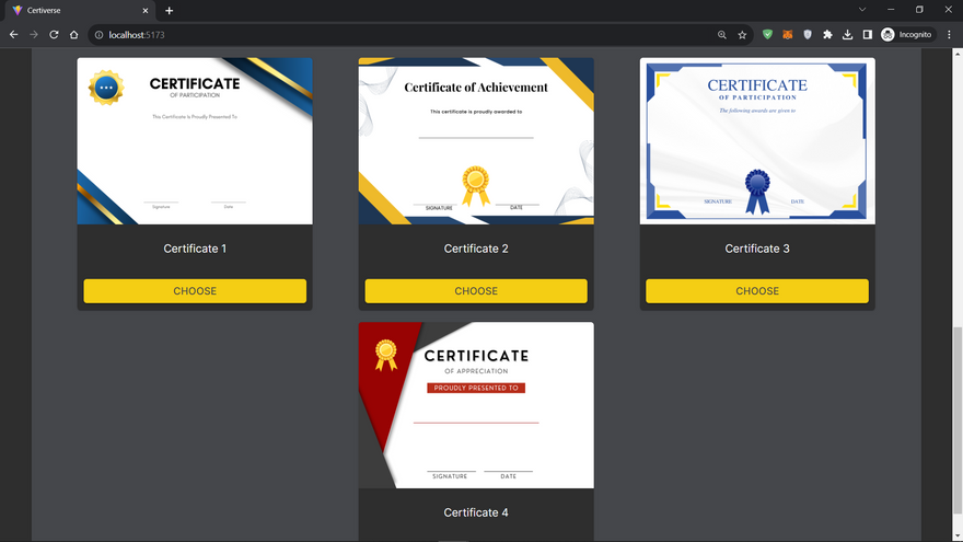We created a Dapp which solves this problem by coverting the generated certificates using blockchain into NFTs (Non Fungible Tokens) which makes them transparent and immutable.