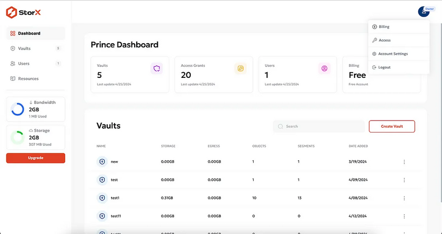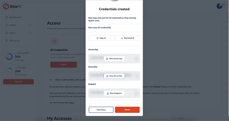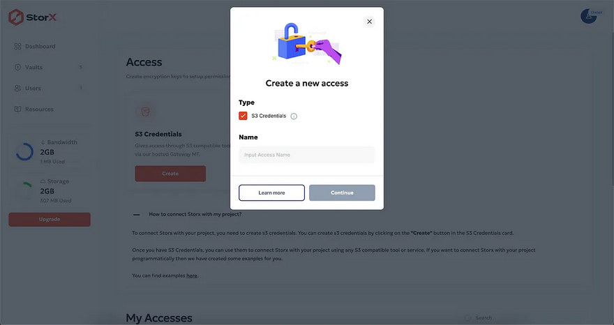 Account in StorX to get the Access credentials.
