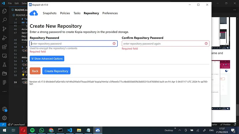- Create your New repository: — ⦁ Provide the repository password. ⦁ Confirm the same repository password. ⦁ Click on the show advanced option to learn more about the encryption, hash algorithm, splitter, repository format, error correction overhead, error correction algorithm, username, and hostname. ⦁ Click on Create Repository.