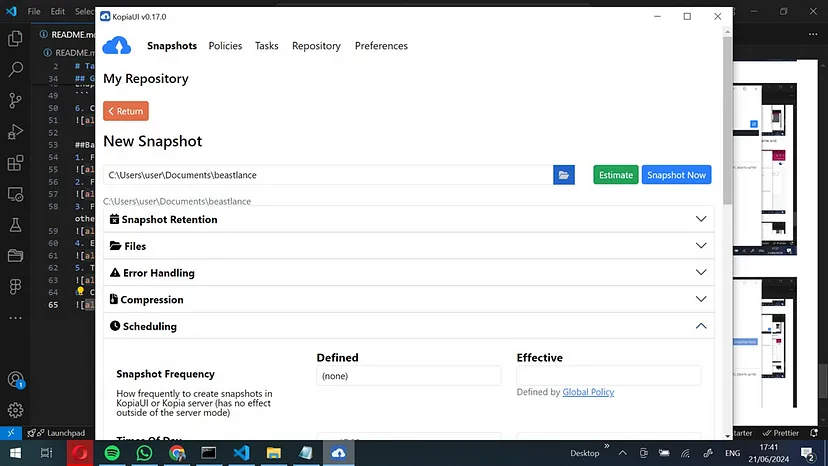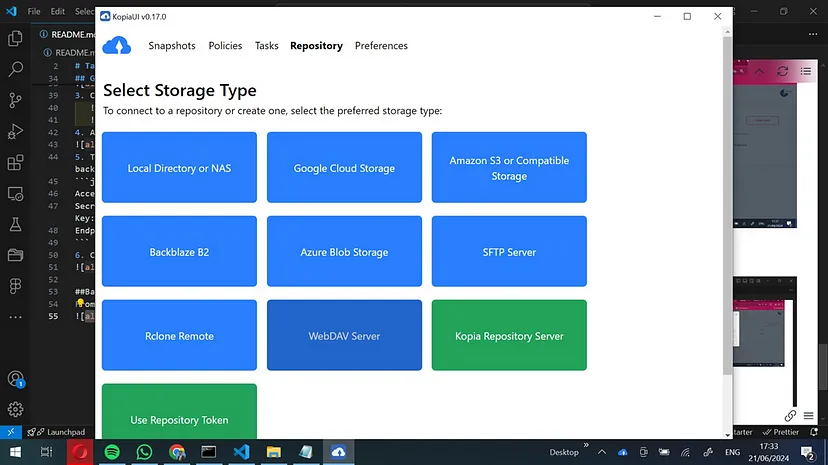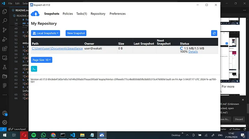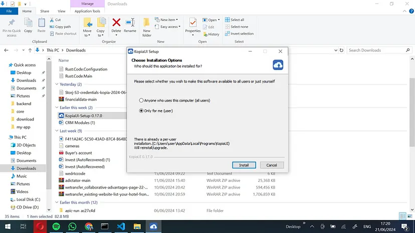 ⦁ Go to the releases page, select the latest tag/version, and download the latest Kopia installer version of Kopia. During the writing of this documentation, the latest version is 0.17.0; therefore, the download will be KopiaUI-Setup-0.17.0.exe