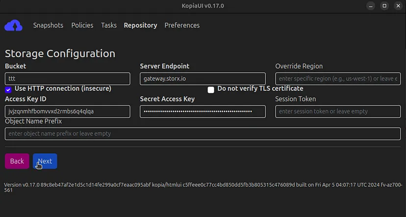 - Fill in the details by using the vault name as the bucket name and other details from the credentials file downloaded.