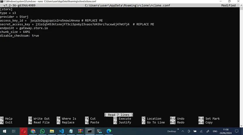 nano C:\Users\user\AppData\Roaming\rclone\rclone.conf # replace with your path to the config fi