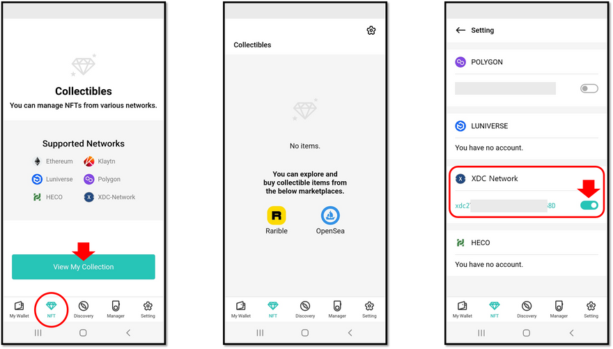The latest addition of XDC Network brings to total of 5 different blockchain networks (XDC Network, HECO, Polygon, Ethereum, and Klaytn) that D’CENT Wallet users can manage NFTs to Receive, Showcase, and Send from the NFT (Collectibles) tab.