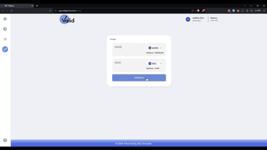 Finally, access the "Swap" function, also found on the left side of your wallet's interface. Here, you will swap WXDC (Wrapped XDC) for XDC. Specify the amount you wish to swap, click "Withdraw," and approve the transaction.