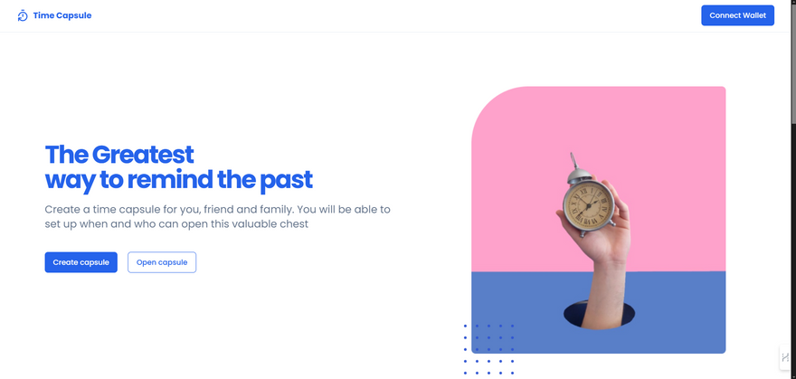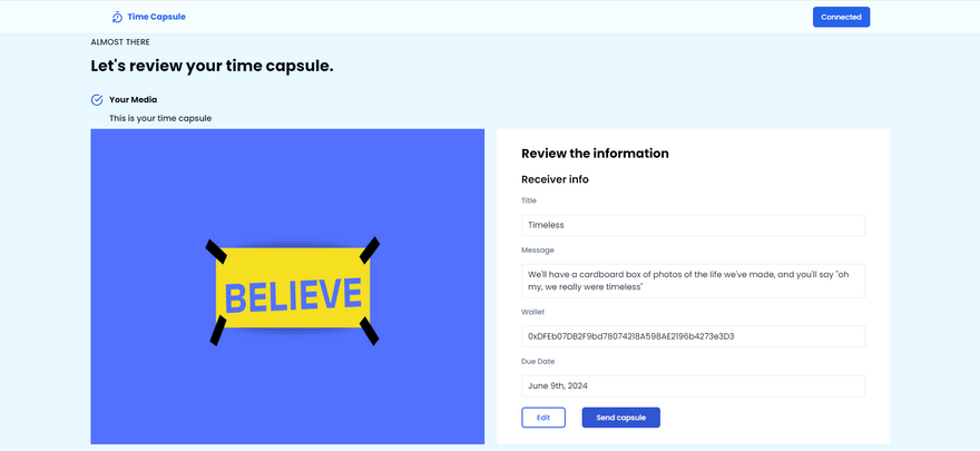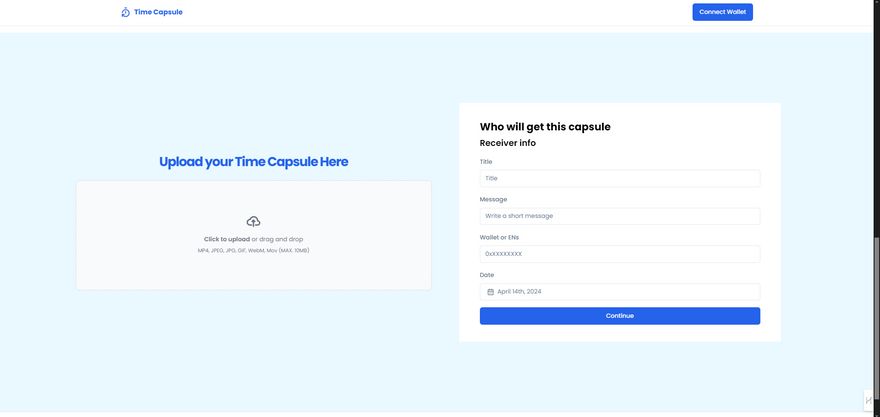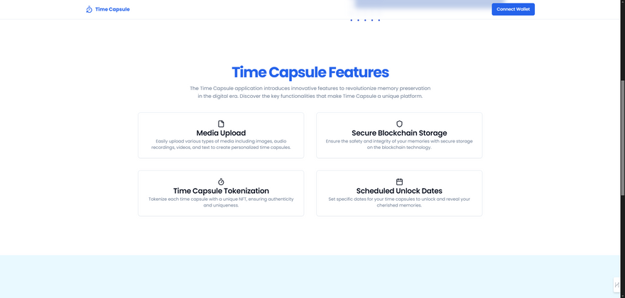 The frontend interface is built using React.js, providing users with a seamless and intuitive experience for interacting with the application. Through the frontend, users can create personalized time capsules, upload various media types, set unlock dates, and manage their digital assets stored on the blockchain.
