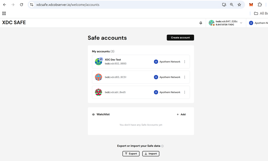 I just created an XDC Safe wallet on the XDC Apothem network using the RPC endpoint: earpc.apothem.network.