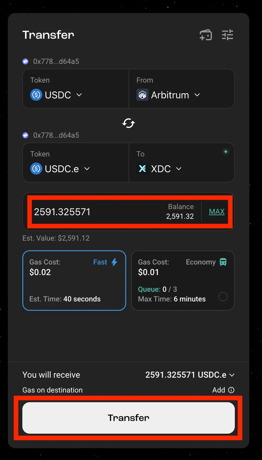 - Amount: Enter the quantity of USDC you wish to bridge.