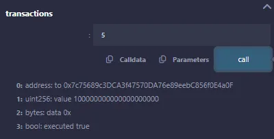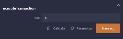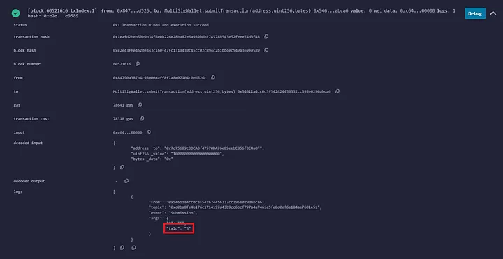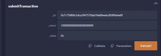 - Call the submitTransaction function with the desired parameters: the recipient address (_to), value (_value) (*add value with 18 ZERO’s), and optional data (_data). This function can only be called by one of the contract owners.