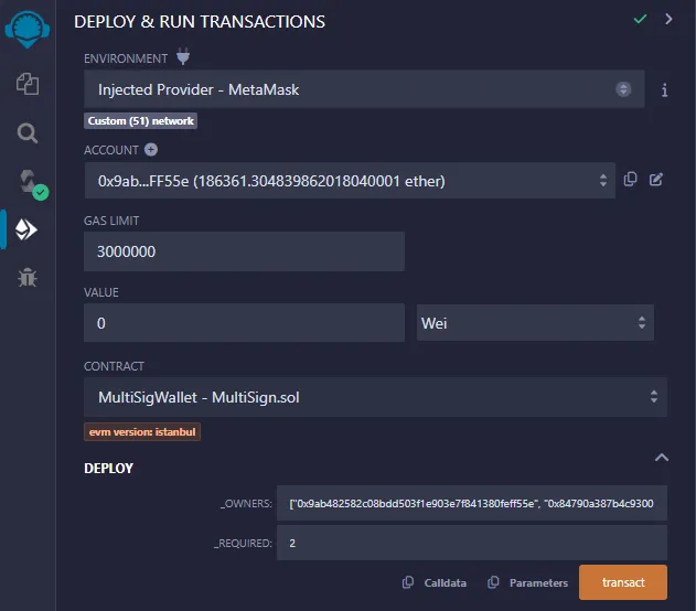 - While Deploying add the “Owners address” in array like [“ox…”,….,”0x..”] and Add confiramtion Required count.