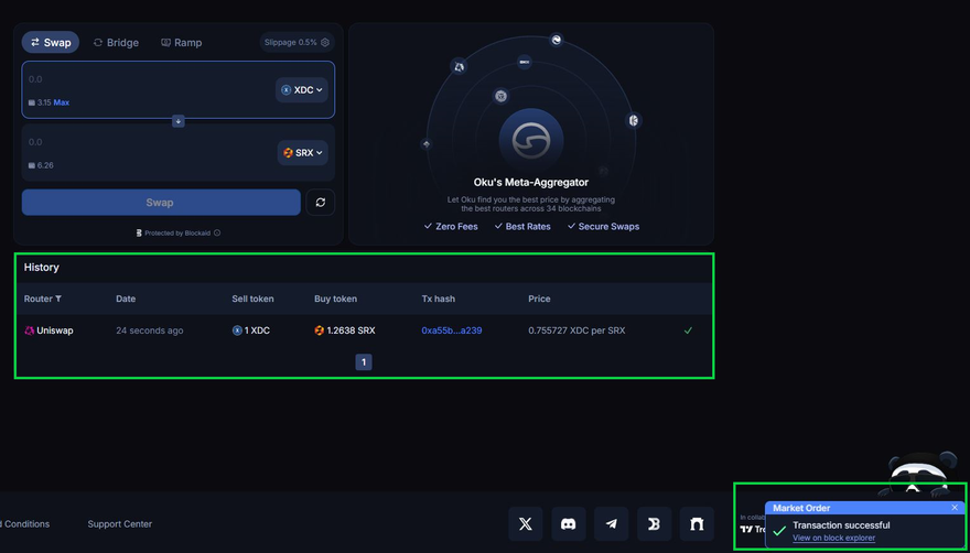 You’ve successfully swapped native XDC using Uniswap V3 on OKU.trade. This process unlocks new DeFi opportunities within the XDC ecosystem — from liquidity provision to on-chain trading — all while staying fully decentralized.