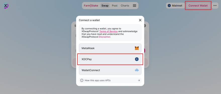 Step 2: Connect your XDCPay wallet to XSwap DEX.