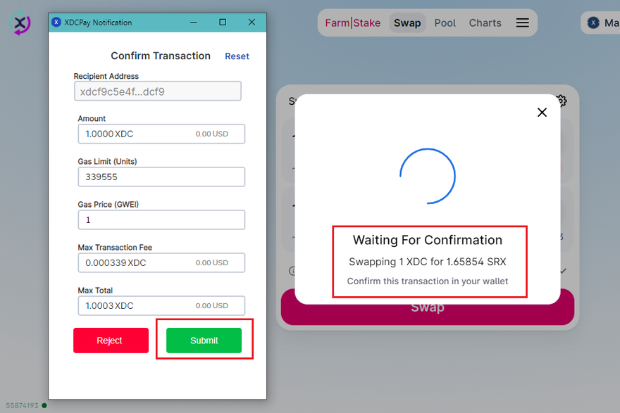 XDCpay screen will pop up to sign the transaction, check all the details, and click on Submit button of the XDCPay screen.