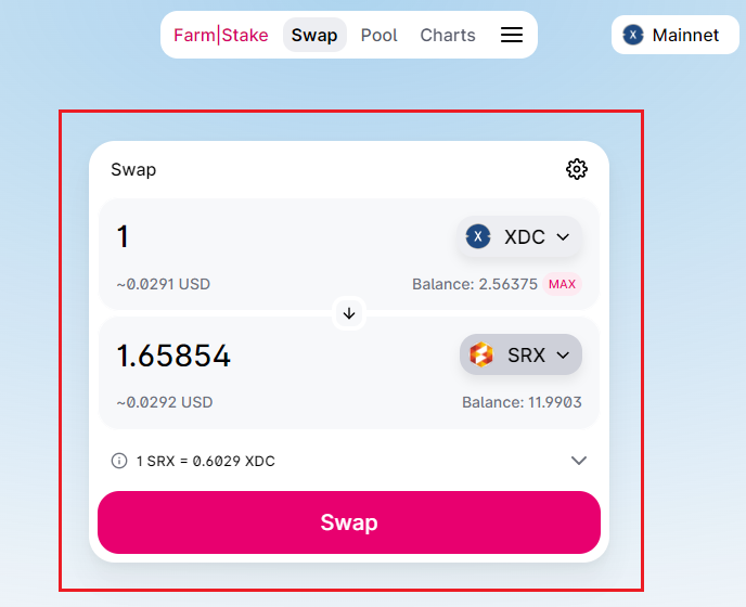 Let's check out how to swap XRC20 tokens with XDC and with other XRC20 tokens (WXDC, XSP, SRX, CGO, BLKZ, BTCx, WTK, PLI, PRNT, GBEX, DC, EURS, USNOTA, etc.):