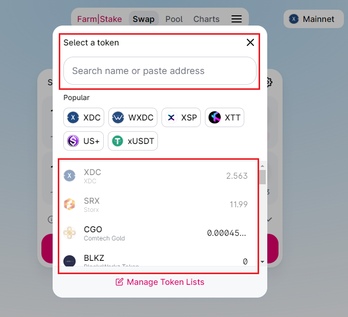 Step 3: Select or Search for the XRC20 token you want to swap with XDC.