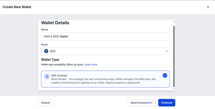 Name your wallet and select Asset as XDC and Choose wallet type “Self-Custody”