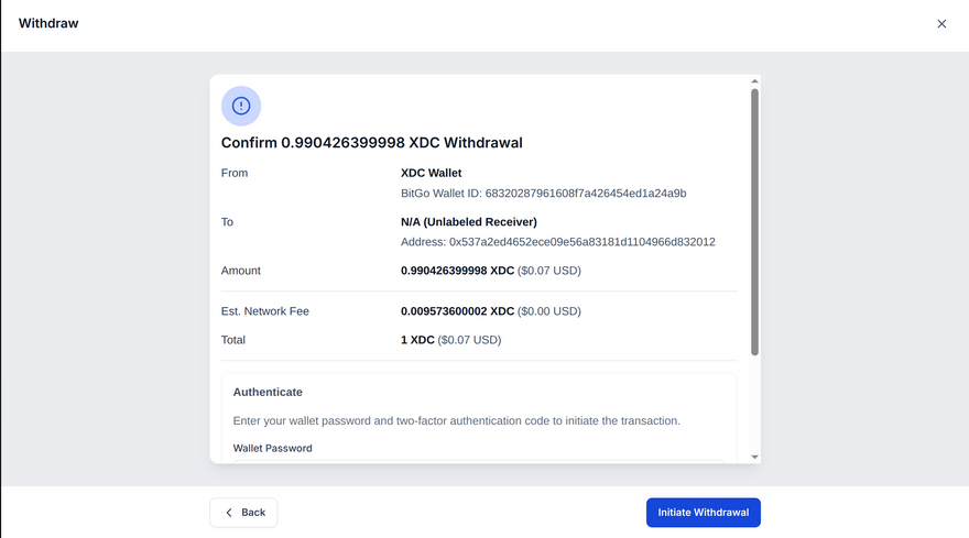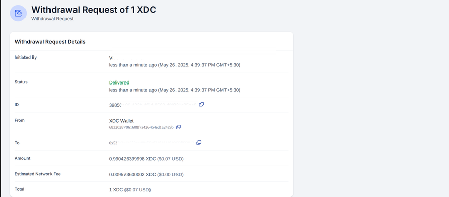 For withdrawal of XDC, Click on the Withdraw button and enter respective details. Preview your entered details and Initiate the withdrawal process by clicking on the “Initiate Withdrawal” button.