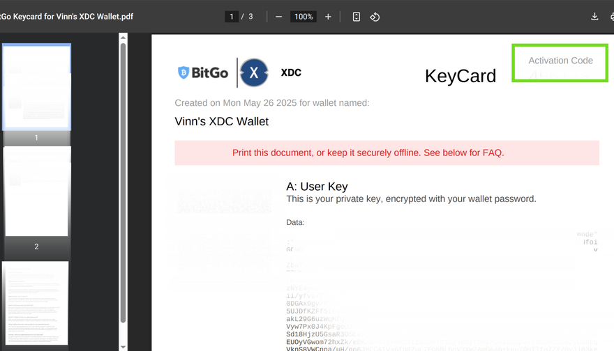 Your KeyCard is an important file that contains sensitive information. For your security, BitGo doesn’t provide this information again. Secure your KeyCard by printing and storing it in a safe location offline, then delete the downloaded file from your computer.