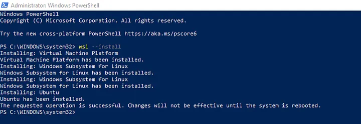 - Open PowerShell or Windows Command Prompt in administrator mode by right-clicking and selecting “Run as administrator”, enter the wsl — install command, then restart your machine.