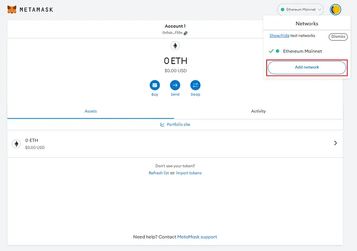 Access the Dapp/Metamask and click on the Network to add XDC Network manually with RPC endpoint.