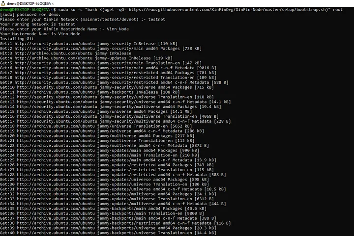demo@DESKTOP-6LOQEIV:~$ sudo su -c "bash <(wget -qO- https://raw.githubusercontent.com/XinFinOrg/XinFin-Node/master/setup/bootstrap.sh)" root