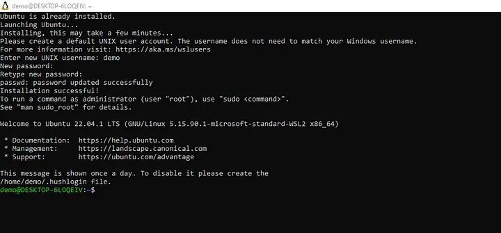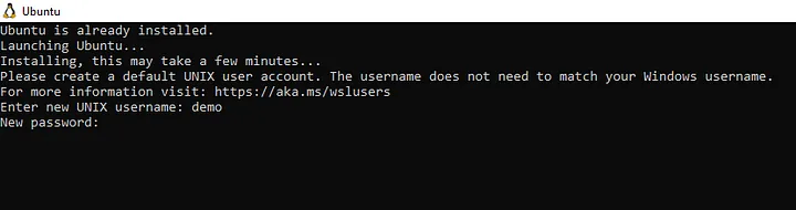 Note that the first time WSL is executed, you will be asked to create a new default username/password.