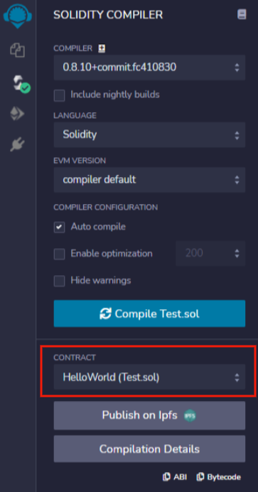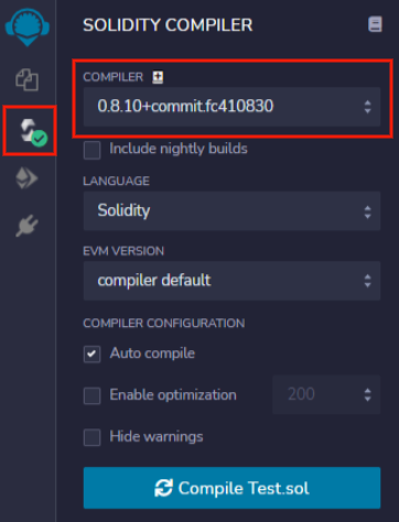 To compile a Smart Contract, go to the “SOLIDITY COMPILER” Tab and select the compiler version and select the appropriate version that is suitable to your Solidity version. Here we are using Solidity version 0.8.10