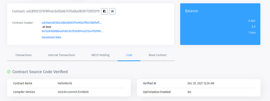 Visit the code tab to confirm that your Contract has been Verified successfully.