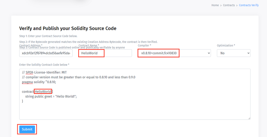 Step 3: Enter the Contract Name and the appropriate Compiler Version on the Verify Contract Page.