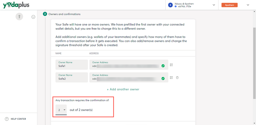 Your Safe will have one or more owners. We have prefilled the first owner with your connected wallet details, but you are free to change this to a different owner.