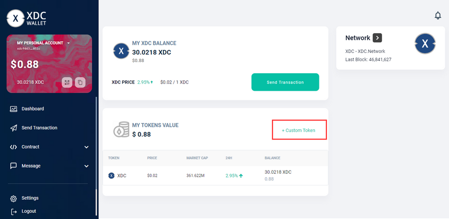 Step 1: After accessing the XDC Web Wallet; On the Dashboard, click ‘Custom Tokens’ to bring up the custom token addition screen. This option is found right next to your token balance.
