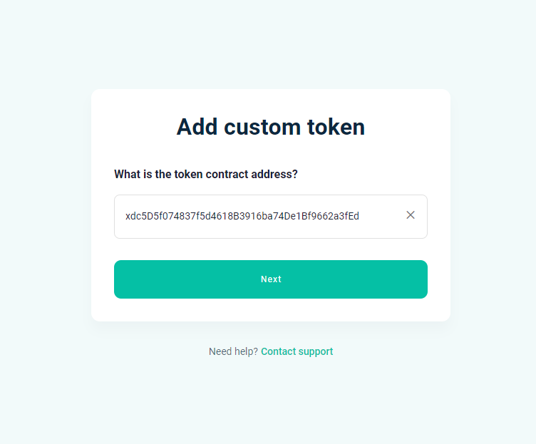 Step 2: Paste the contract address into the contract address field then click 'Next' so that XDC Web Wallet can scan the address.