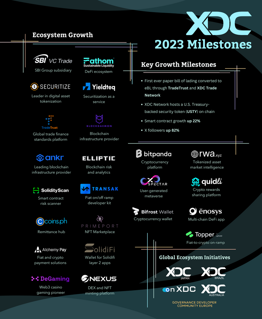 This year saw influential global events that point to a promising future for blockchain adoption. Landmark legislation in the UK enabling electronic bills of lading (eBLs) set the stage for increased flows of global liquidity onto blockchain. Through adoption in strategic geographic locales and the launch of real world asset tokenization (RWA) on-chain, along with integrations with leading providers in the trade finance industry, the XDC Network is uniquely positioned to provide solutions for the trade finance gap.