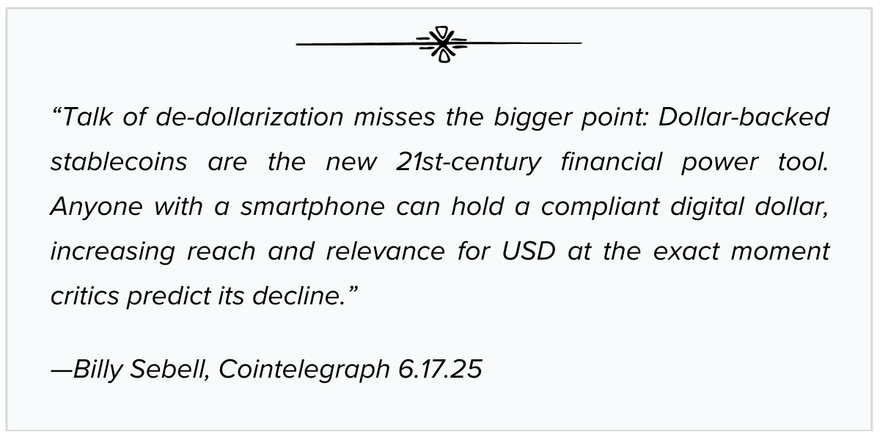 This year’s passage of the Guiding and Establishing National Innovation for U.S. Stablecoins Act (GENIUS Act) provided the long-awaited rails governing stablecoin issuance and usage in the U.S. It offers consumer protections through strong reserve requirements and provides a safe passage for institutions longing to enter the digital asset space. In the process, the GENIUS Act strengthens the U.S. dollar’s reserve currency status. It also provides the blueprint for more regulatory advancements.