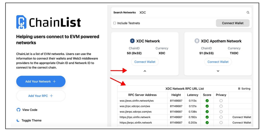 - RPC URL not working or not available - The RPC (remote procedure call) URL is used to call functions and information from the XDC Network. Should there be a temporary issue with the RPC in your setup, there are other RPCs to choose from. Chainlist.org offers multiple RPC server options. Just click on the dropdown below the Connect Wallet button and select another RPC.