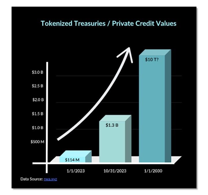The world waits in anticipation for the Securities and Exchange Commission to approve the first spot bitcoin ETF in the U.S. The possibility exists, of course, that market capitalization of the spot ETFs will quickly exceed that of RWA — providing another strong indicator of TradFi’s increased valuation of blockchain-based instruments.