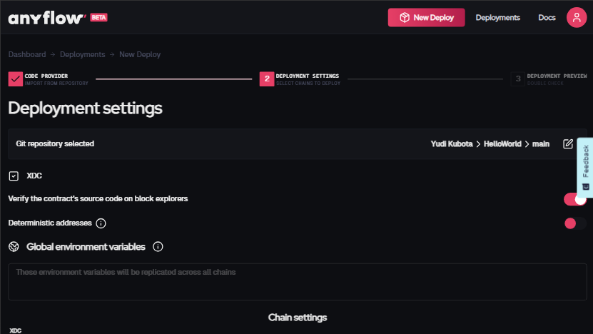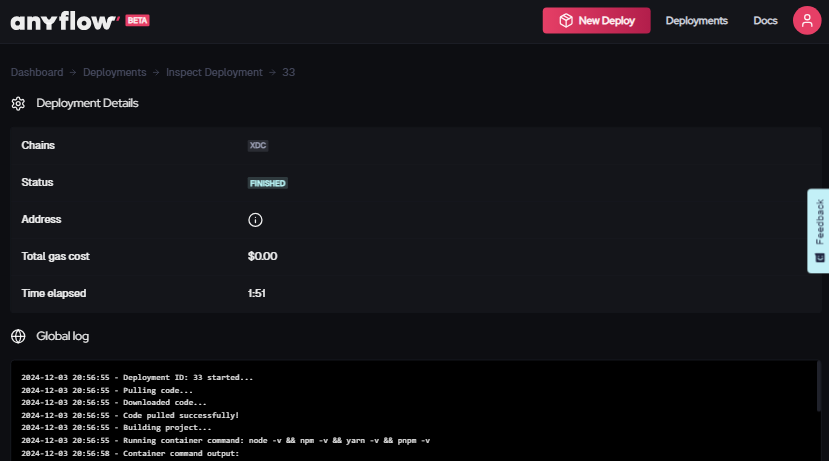 AnyFlow is a deployment platform that empowers developers to deploy smart contracts on XDC Network and other blockchains with just a few clicks. No need to worry about private keys, account funding, execution order, or network setup—AnyFlow handles it all for you.